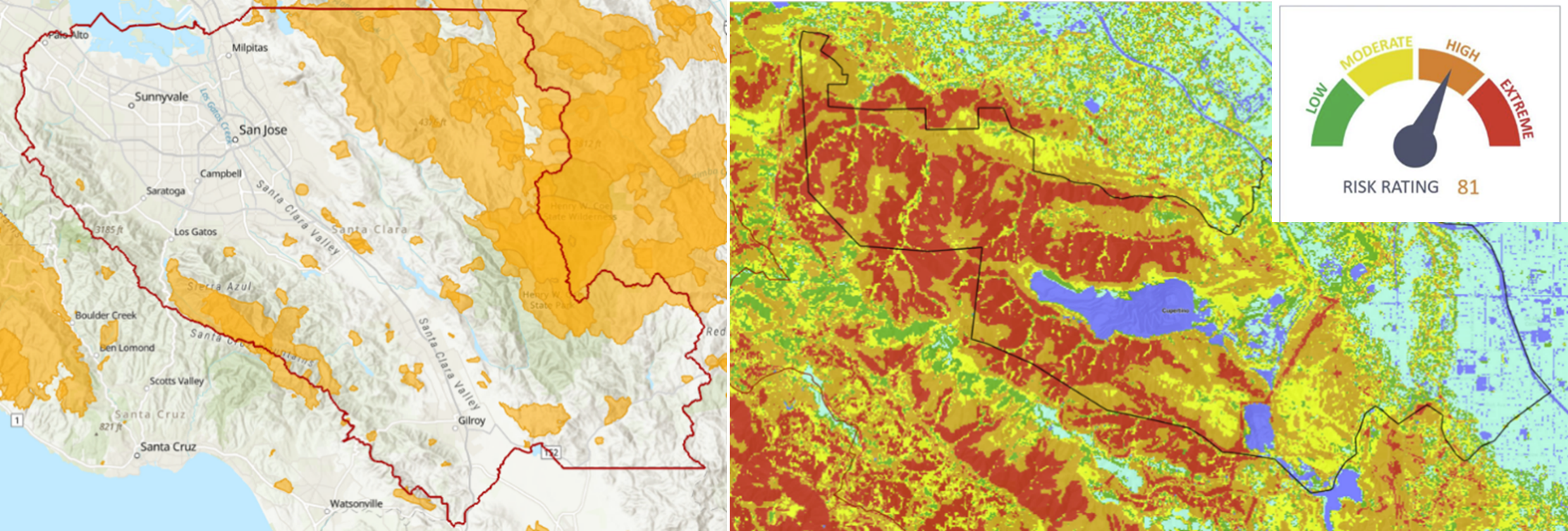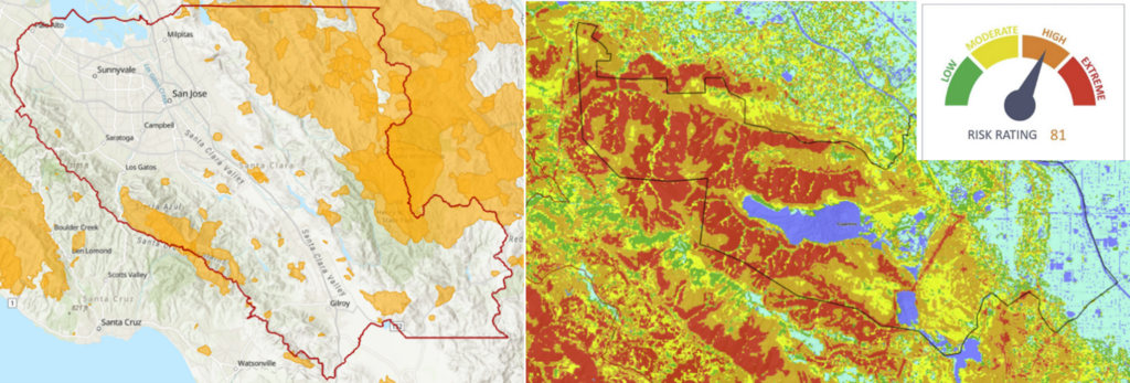 Figure 1: Santa Clara County’s CWPP covers more than 2,000 acres of high-risk land (left). The risk of wildfires is high and increases on a yearly basis (right). Source: The Climate Drive.
